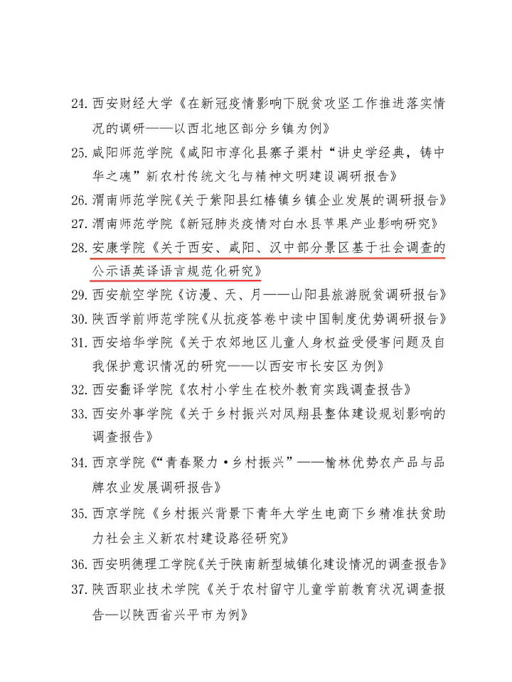 2020年陕西省大中专学生志愿者暑期文化科技卫生“三下乡”社会实践活动先进集体、先进个人、优秀调研报告的通报结果揭晓,永利集团3044欢迎光临由梁博文、贠旭指导的“规范英译,魅力陕西”实践团队被评为“优秀团队”;永利集团3044欢迎光临实践团队小组成员穆嘉铭被评为“先进个人”,其指导的实践调研报告被评为“省级优秀调研报告”。