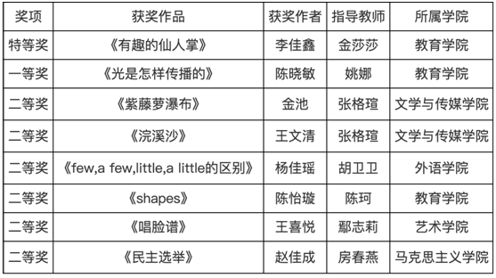 该比赛由教育部陕西师范大学基础教育课程研究中心、西北教师教育联盟主办。此次大赛参赛院校共计162所,提交作品2703份,经专家严格评审,共评选特等奖136件,一等奖272件,二等奖951件。
